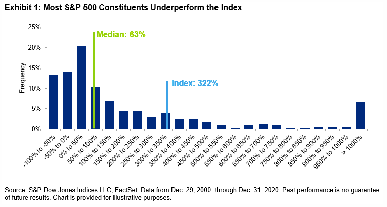 2: The chart below demonstrates the case against stock picking. It shows a distribution of S&P 500 constituent returns during the 20 years ending December 31, 2020. The blue line shows what the broad S&P 500 index did (322% cumulative) during that period. Most companies in the index generated far lower returns.