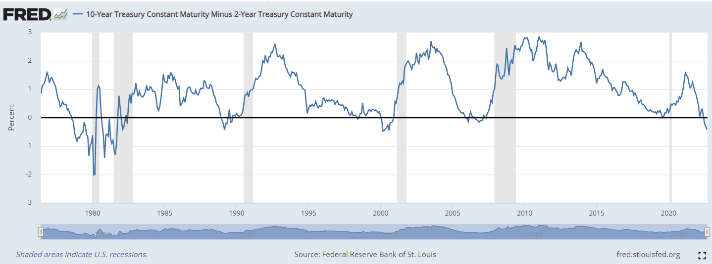 3: An inverted yield curve is typically a signal that a recession is coming. Today, the yield curve (2s-10s) is the most inverted in over 20 years.