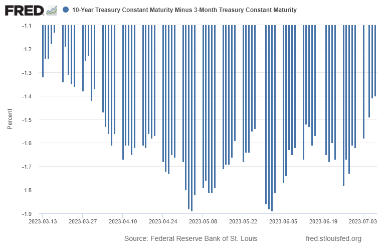 Meanwhile, the 10yr-3mth yield curve inversion shrank by almost 50bps recently (second chart) as longer duration yields rise in response to stronger-than-expected employment data. I suspect the market is starting to price in a more hawkish Fed than originally anticipated. To squeeze the last drops of inflation out, the Fed may need to tighten more and for longer than anyone anticipated. Remember, the yield curve inverts in anticipation a recession (that can take up to 18mths to materialize) but begins to steepen as the recession materializes.