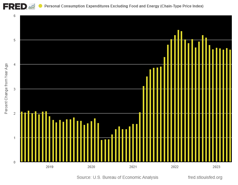 But wait! While inflation seems like it’s declining, it will prove to be stickier than anticipated. Core PCE - the Fed’s preferred measure of inflation - has been flat around 4.5% for several months (first chart below) and real yields on 5+ year Treasuries remain negative suggesting the yield curve remains accommodative. Inflation remains well above the Fed’s 2% target. Powell can't be pleased.